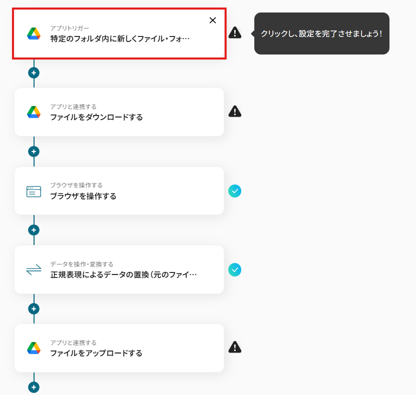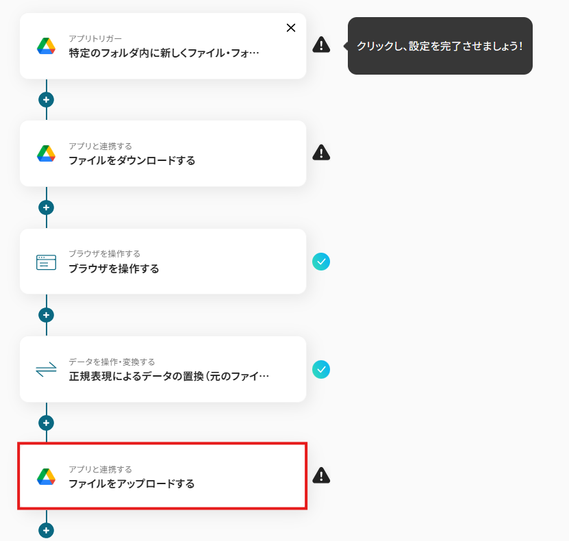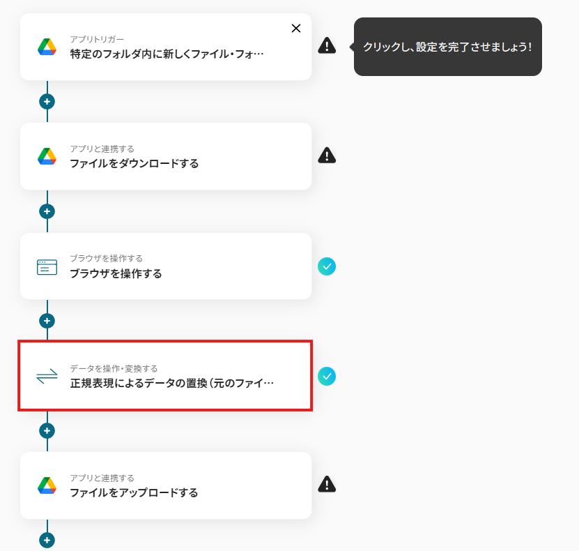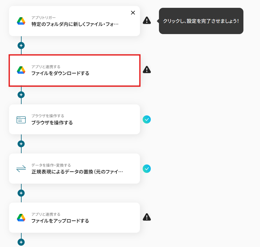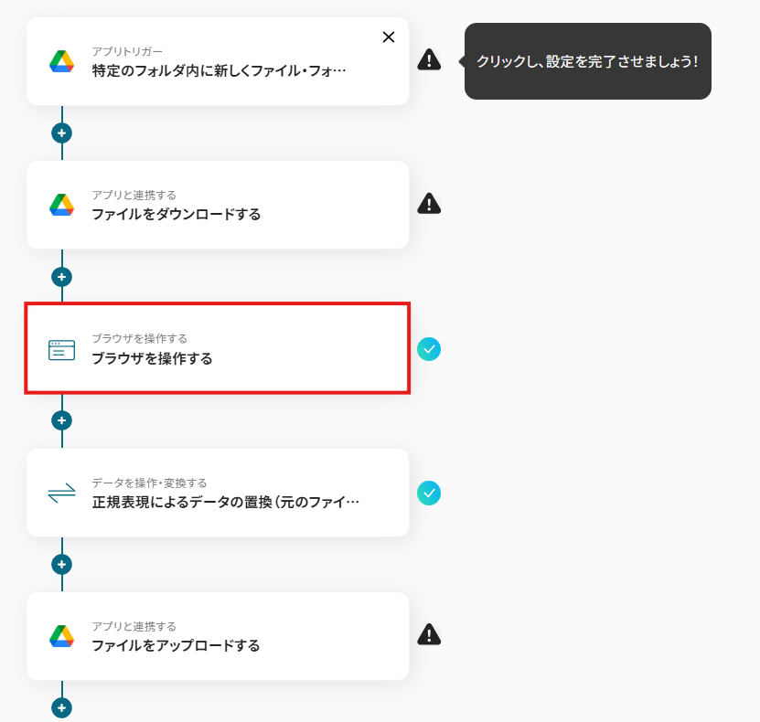 ファイルを変換するためのWeb上の操作として、「3.クリック」というアクションを追加しています。