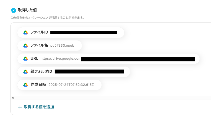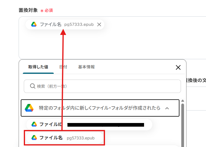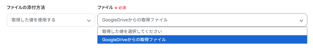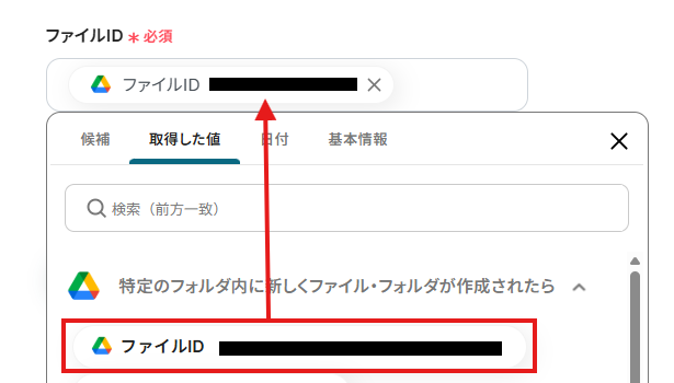 「ファイルID」は、入力欄をクリックして表示される取得した値から選択してください。