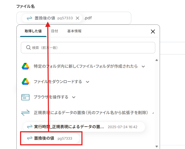 「ファイル名」は、入力欄をクリックして表示される取得した値から選択してください。