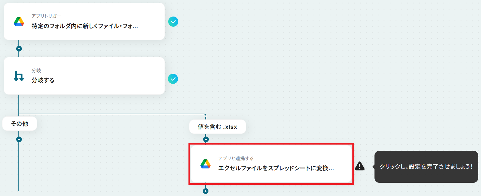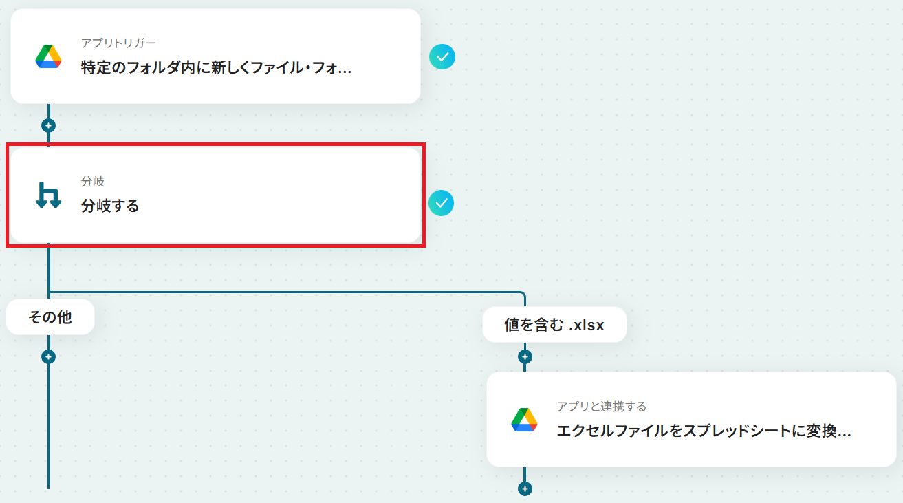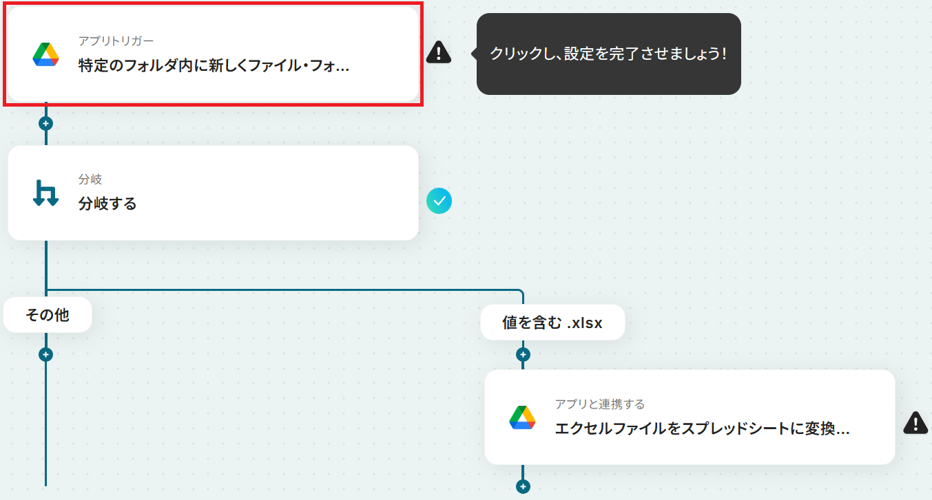 Google Driveのトリガー設定、分岐設定、Google Driveのアクション設定
