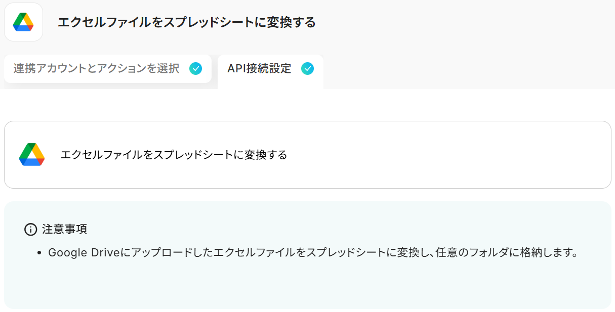 ステップ5:Google Driveのアクション設定 ステップ3で取得したMicrosoft ExcelファイルをGoogle スプレッドシートに変換します。「エクセルファイルをスプレッドシートに変換する」をクリックしましょう。