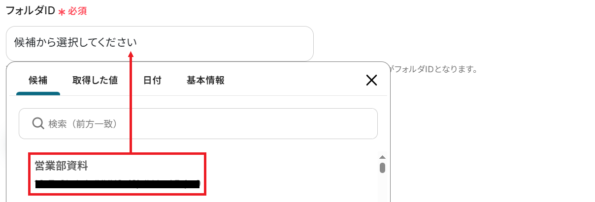 Google Driveでファイル一覧を取得するアクションで、対象としたいフォルダのIDを任意で設定してください。 繰り返し処理の中でGoogle Driveからファイルをダウンロードする際に、ファイルIDを動的に指定してください。 Dropboxにファイルをアップロードするアクションで、格納先のフォルダパスやファイル名、ファイルの添付方法を任意で設定してください。 ■注意事項