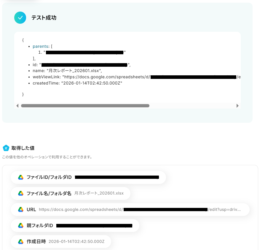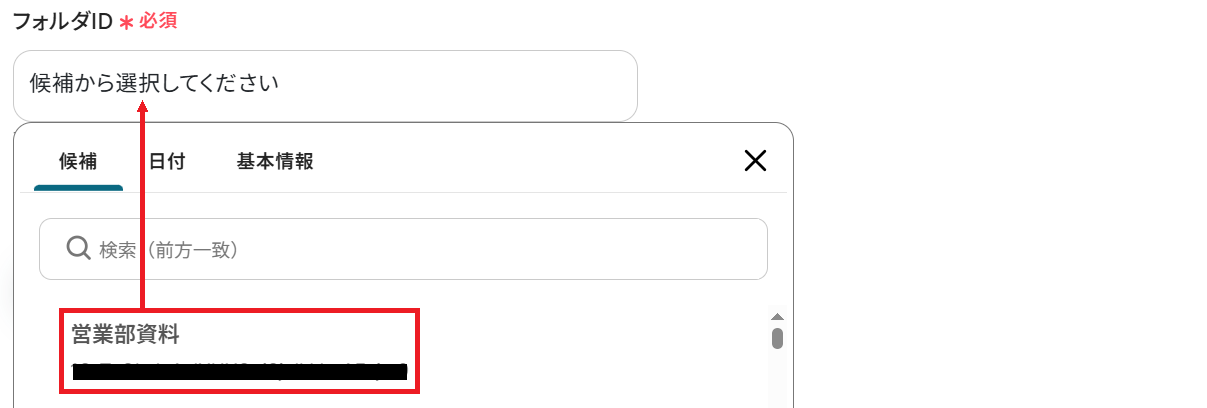 次に、先ほどファイルを格納したGoogle DriveのフォルダID を候補から選択してテストしてください。