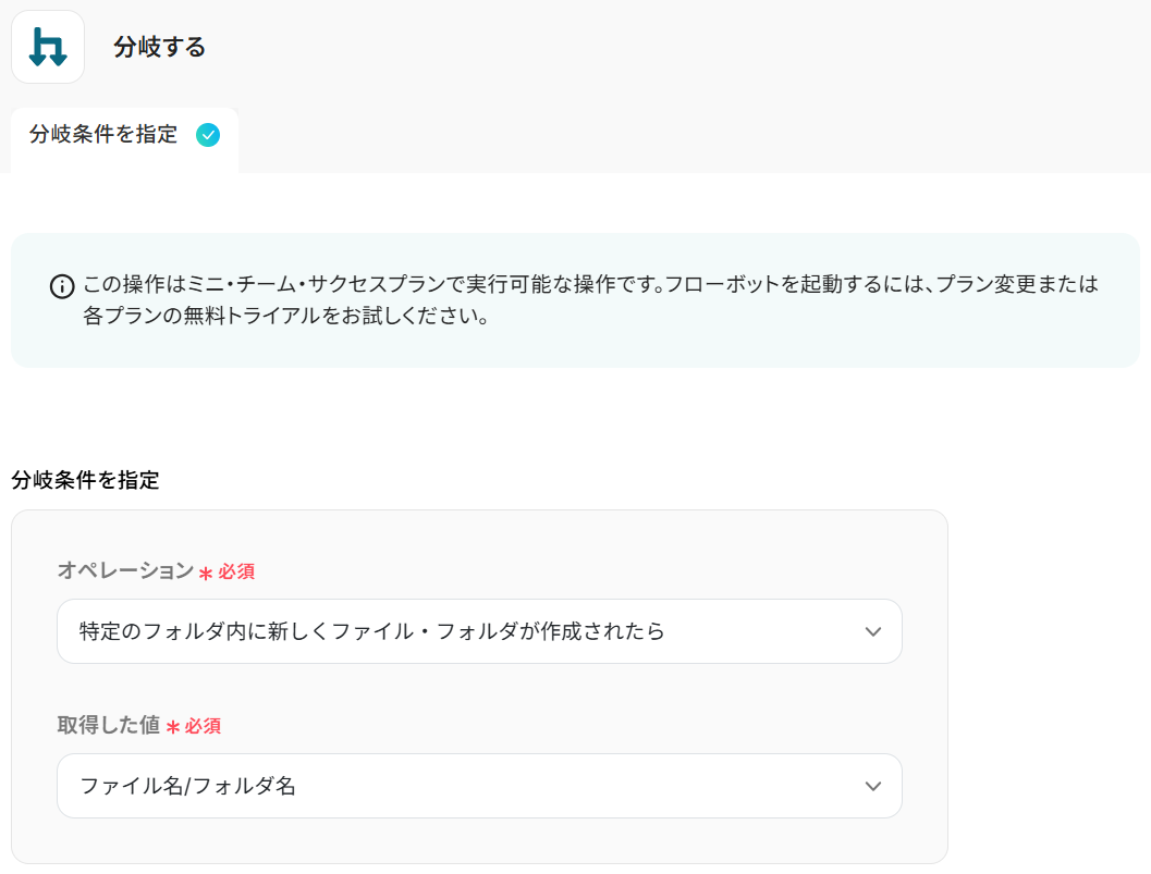 Google DriveとYoomを連携してください。 分岐はミニプラン以上のプランでご利用いただける機能(オペレーション)となっております。フリープランの場合は設定しているフローボットのオペレーションはエラーとなりますので、ご注意ください。 ミニプランなどの有料プランは、2週間の無料トライアルを行うことが可能です。無料トライアル中には制限対象のアプリや機能(オペレーション)を使用することができます。 トリガーは5分、10分、15分、30分、60分の間隔で起動間隔を選択できます。 プランによって最短の起動間隔が異なりますので、ご注意ください。