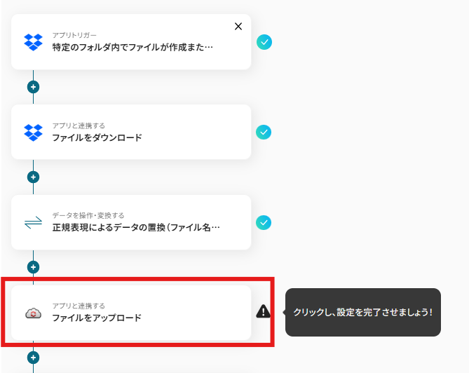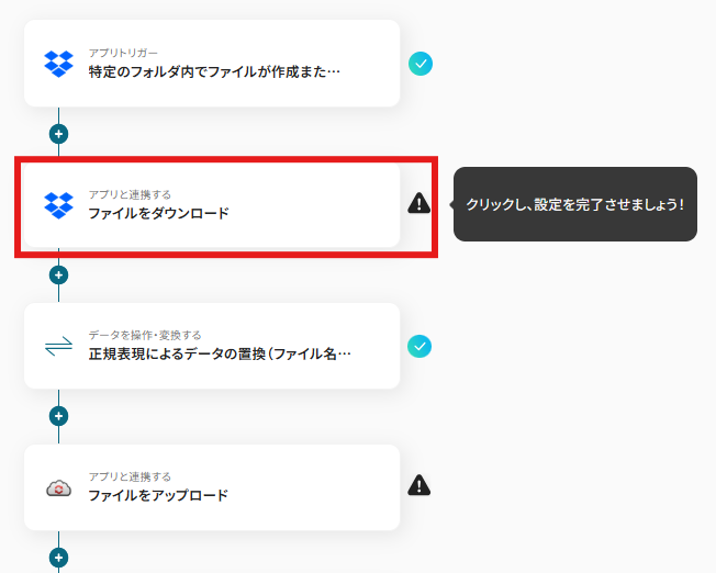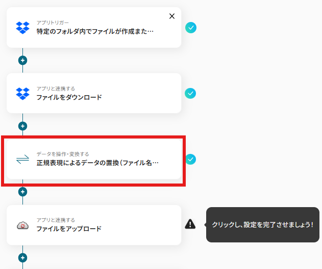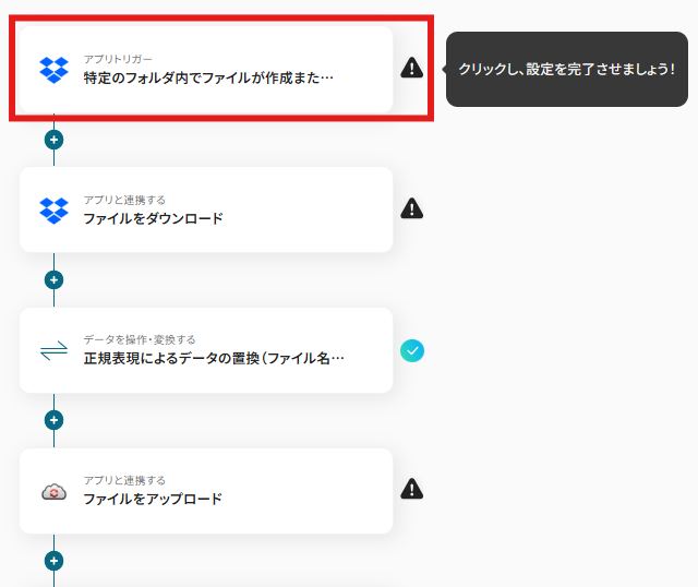 - Dropboxのトリガー設定と、正規表現によるデータの置換アクション設定、CloudConvertのアクション設定、Dropboxのアクション設定