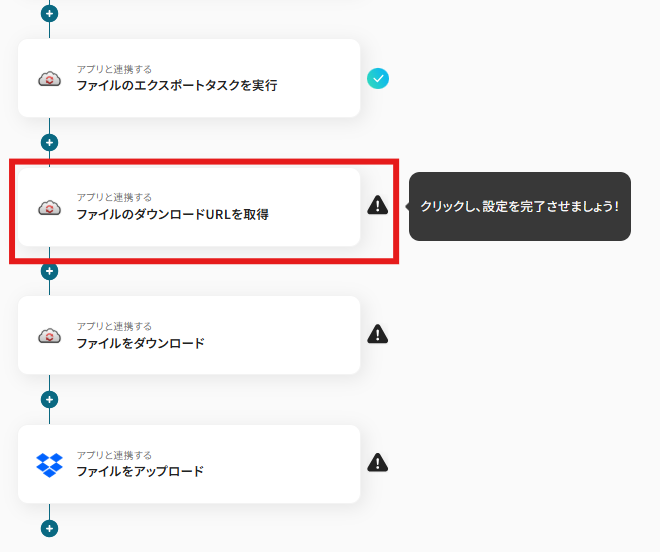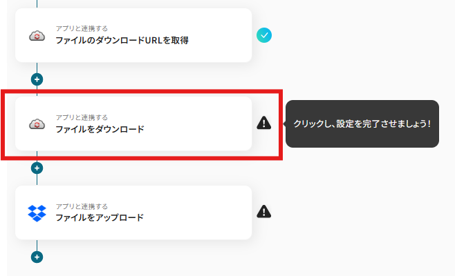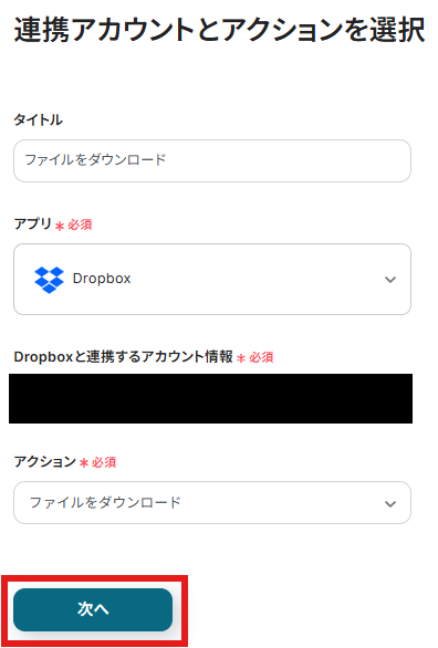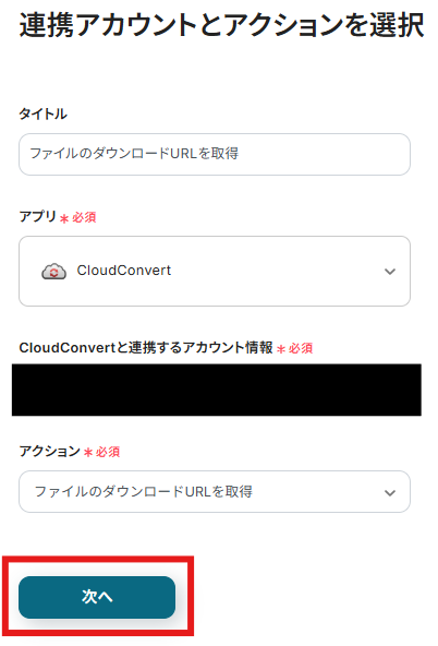 「アクション」には「ファイルのダウンロードURLを取得」がデフォルトで設定されているので、変更せずに「次へ」を選択します。
