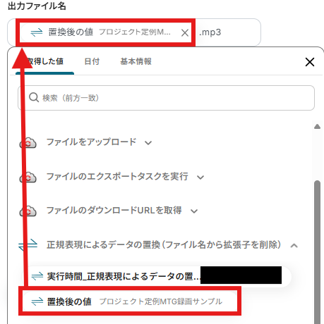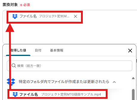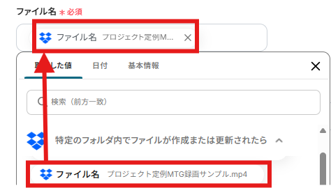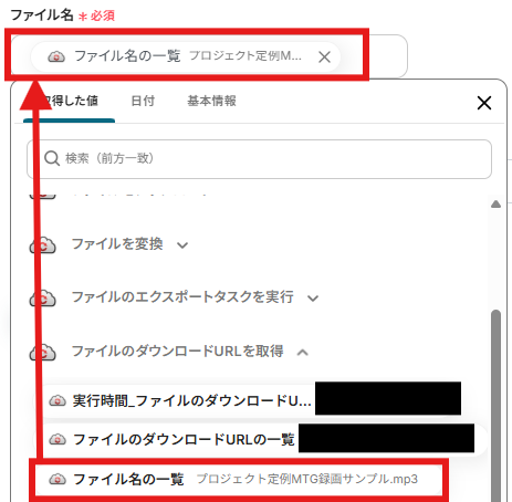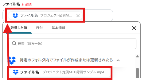 「ファイル名」を設定しましょう。「取得した値」を使用できます。