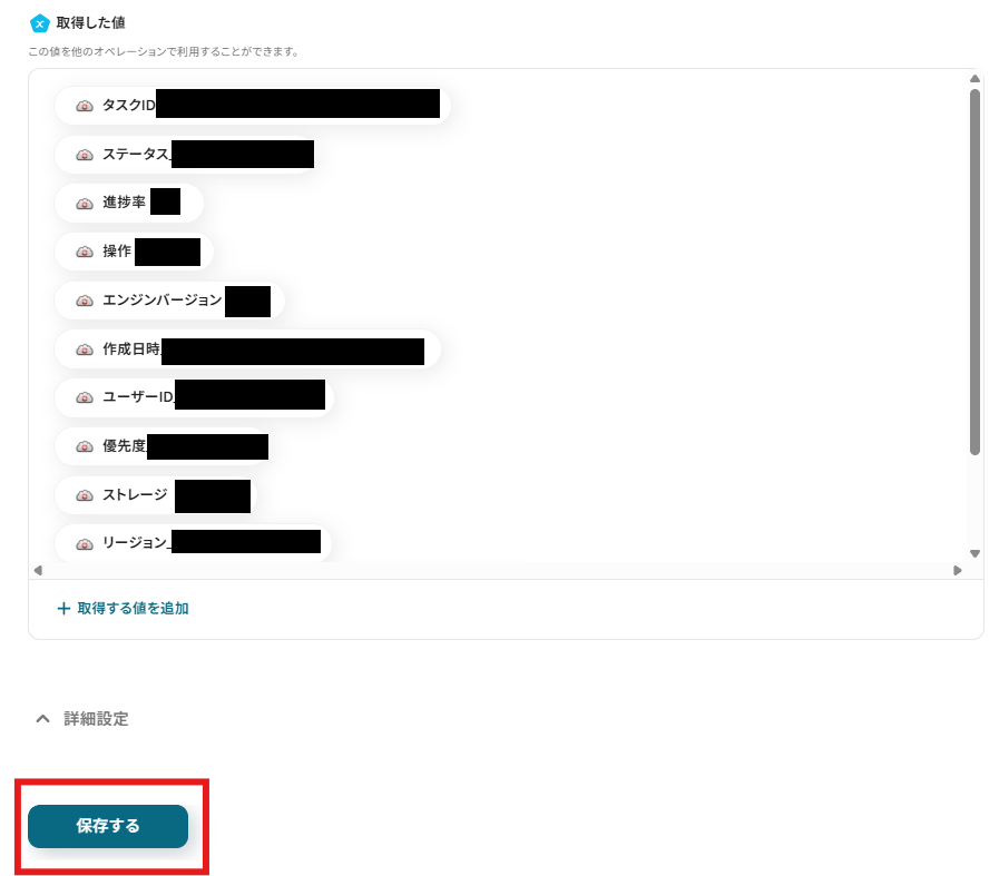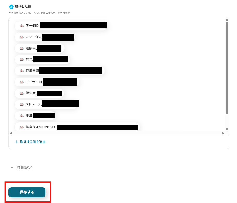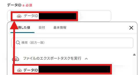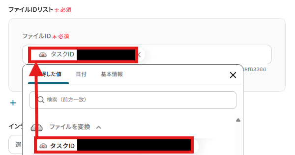 「ファイルIDリスト」を設定します。「取得した値」から「タスクID」を設定しましょう。