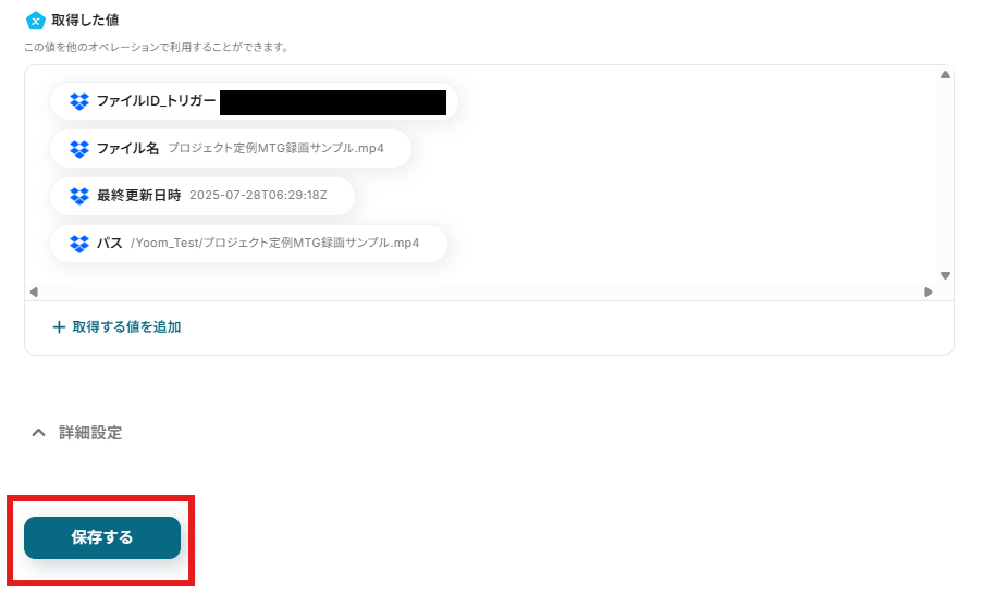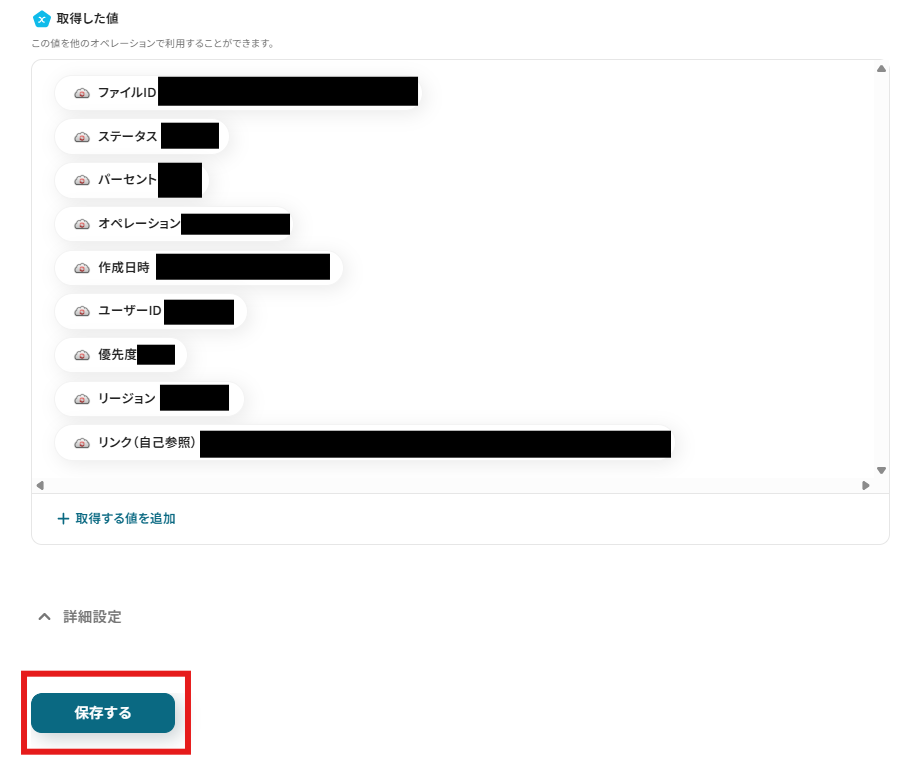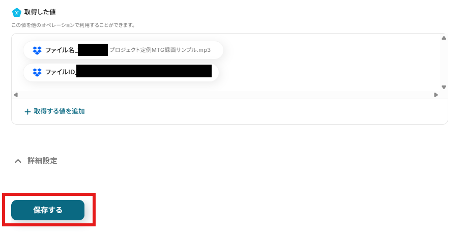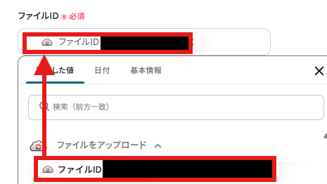 「ファイルID」を設定しましょう。「取得した値」を使用できます。