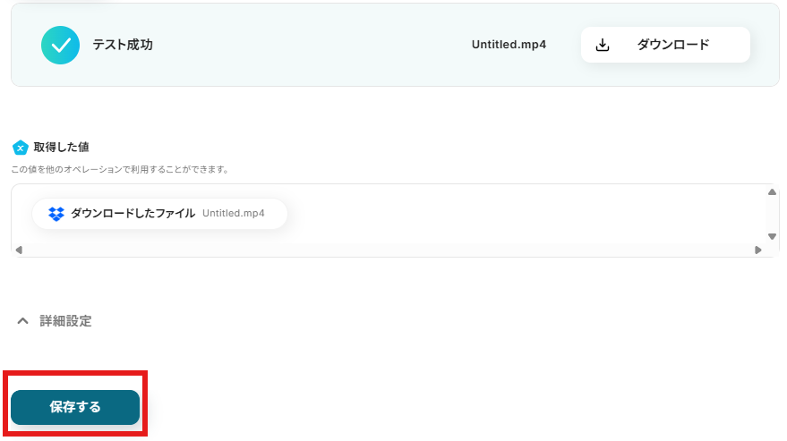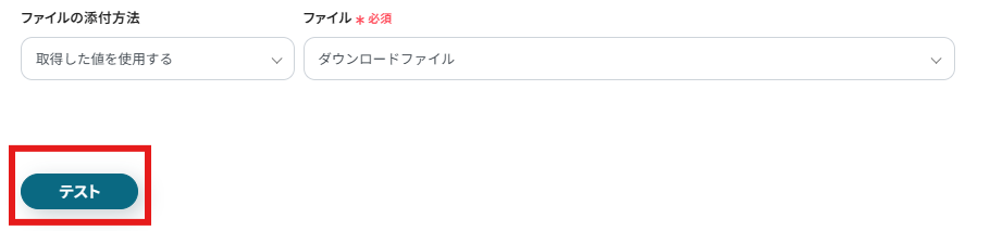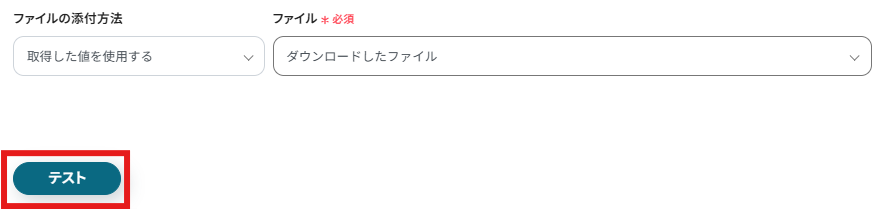 「ファイルの添付方法」に「取得した値を使用する」が、「ファイル」に「ダウンロードしたファイル」が設定されていることを確認して「テスト」を行いましょう。