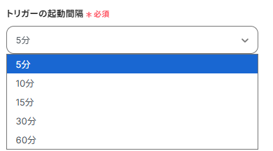 - トリガーの起動タイミングは、5分、10分、15分、30分、60分のいずれかで設定できます。