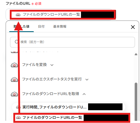「ファイルのURL」を設定しましょう。「取得した値」を使用できます。