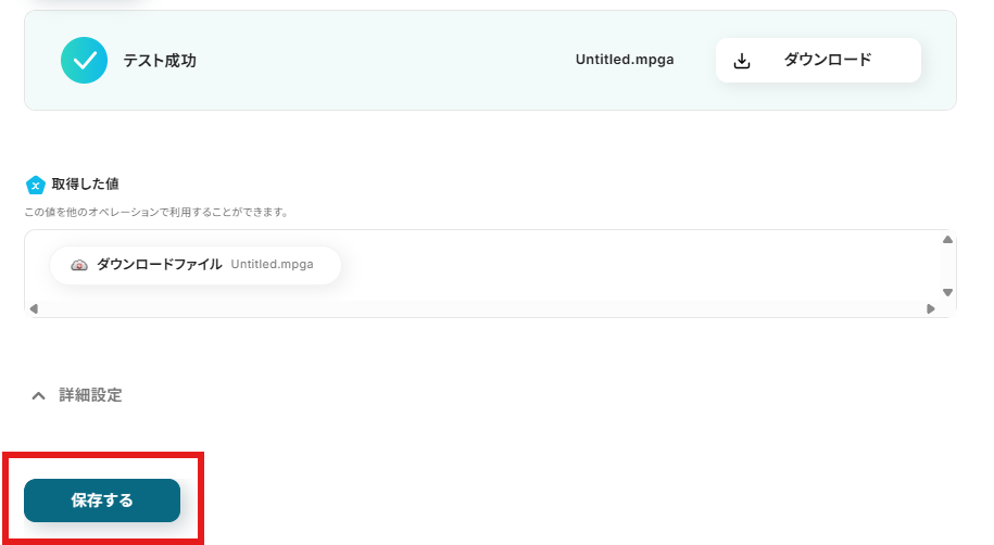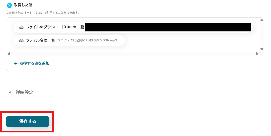 「出力ファイル名」を設定しましょう。「取得した値」を使用できます。