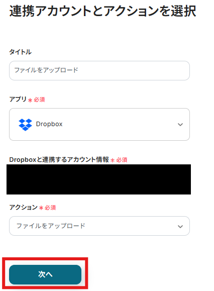 「アクション」には「ファイルをアップロード」がデフォルトで設定されているので、変更せずに「次へ」を選択します。