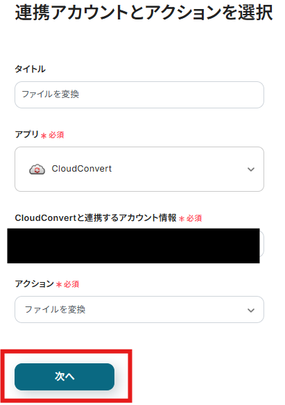 「アクション」には「ファイルを変換」がデフォルトで設定されているので、変更せずに「次へ」を選択します。