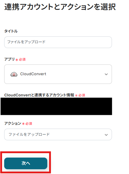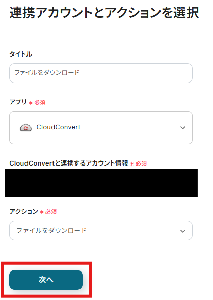 「CloudConvertと連携するアカウント情報」は基本的にマイアプリ登録をしたアカウント名が表示されています。