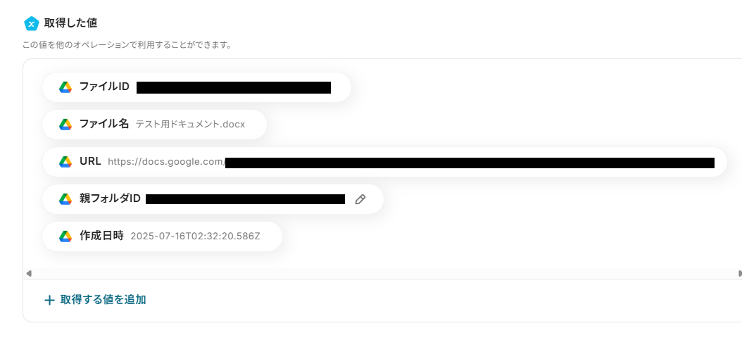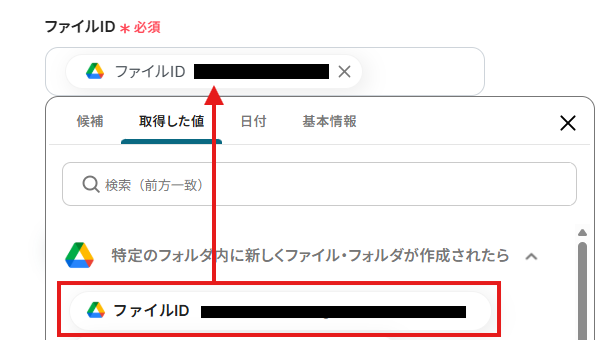「ファイルID」は、入力欄をクリックして表示される取得した値から選択してください。