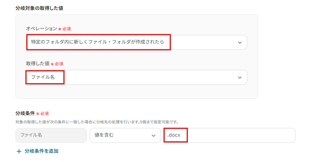 ・分岐はミニプラン以上のプランでご利用いただける機能(オペレーション)となっております。フリープランの場合は設定しているフローボットのオペレーションはエラーとなりますので、ご注意ください。