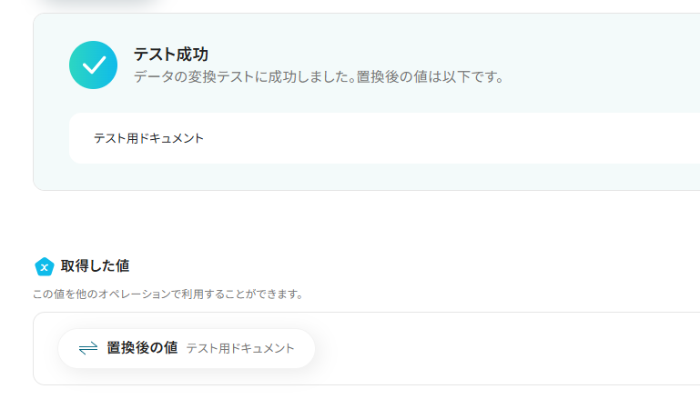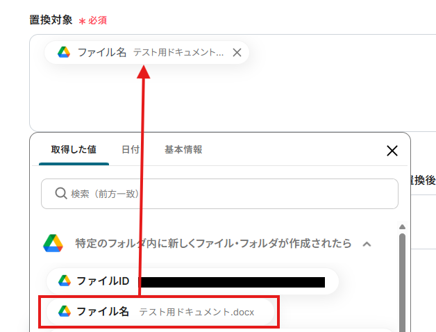 「置換対象」は、入力欄をクリックして表示される取得した値から選択してください。