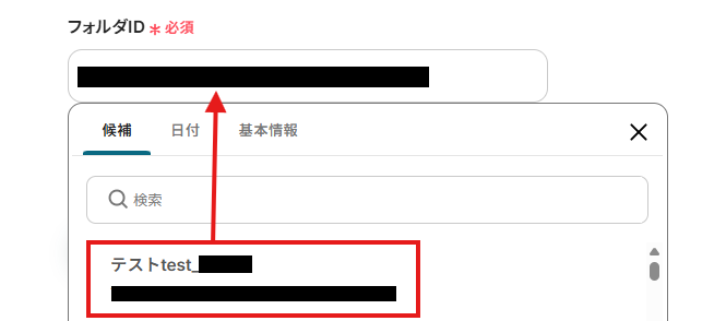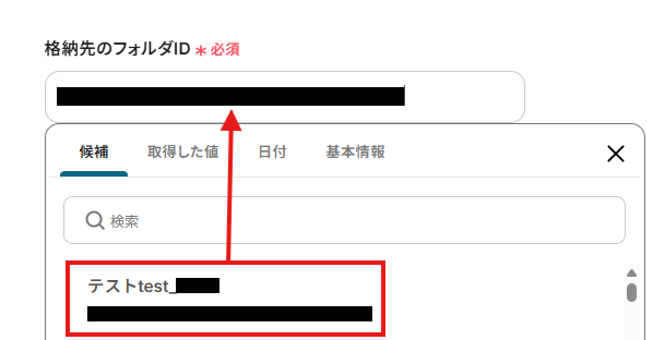 「格納先のフォルダID」は、入力欄をクリックして表示される候補から選択してください。