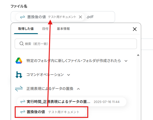 「ファイル名」は、入力欄をクリックして表示される取得した値から選択してください。