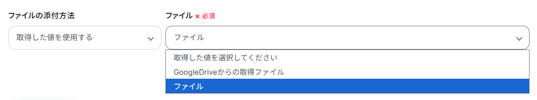 「ファイルの添付方法」と「ファイル」は、プルダウンから選択してください。
