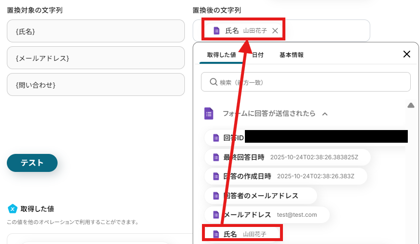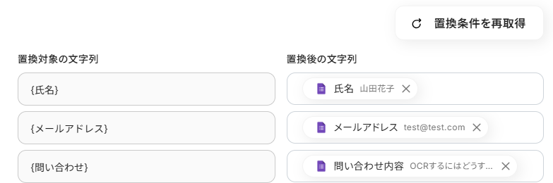 置換後の文字列はうまく設定ができていればすでに入力されていますが、入っていない場合は「取得した値」より当てはまるものを入れていってください。