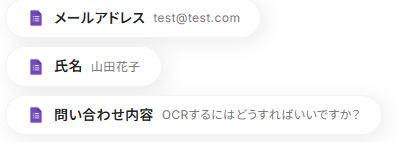 今回は「氏名」「メールアドレス」「問い合わせ内容」を取得した値に格納しました。