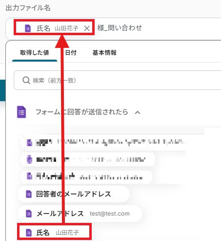 ・Googleフォームをトリガーとして使用した際の回答内容を取得する方法は下記をご参照ください。