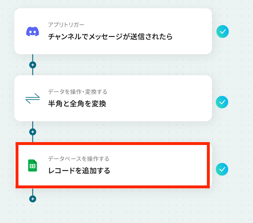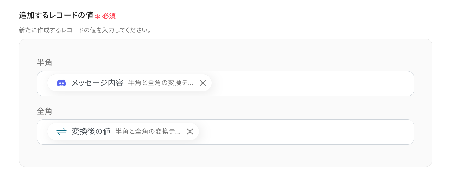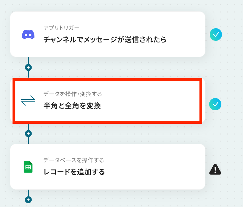 このワークフローを活用すれば、Discordの特定チャンネルでのメッセージ受信をトリガーとして、内容に含まれる半角英数字から全角への自動変換を行い、指定したGoogle スプレッドシートへ自動でデータを追加できます。