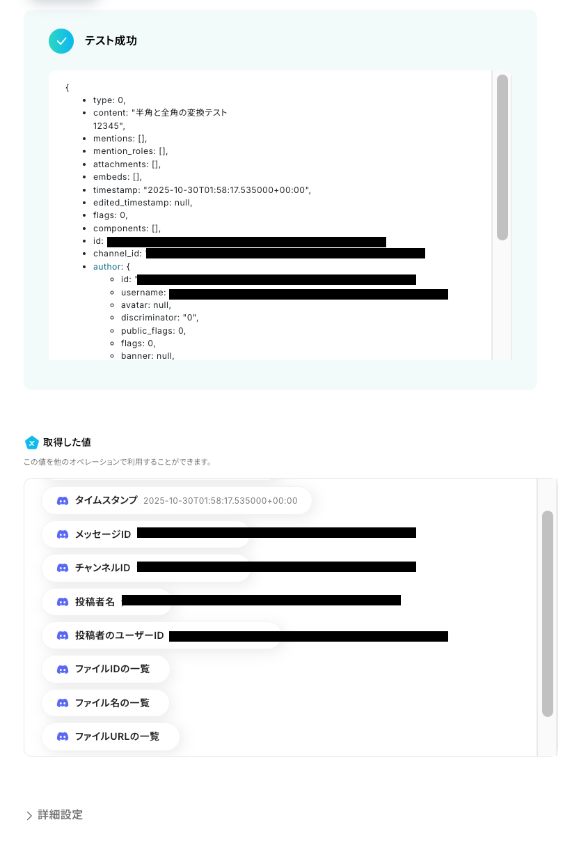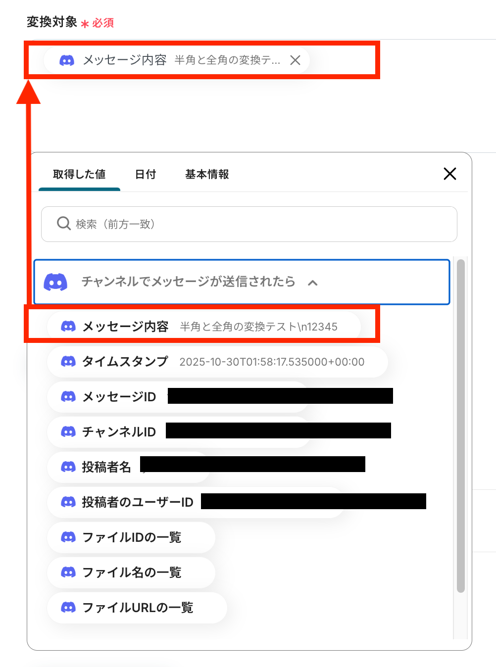 - 対象のテキスト:入力欄をクリックすると、下記のような取得した値が表示されますので、Discordの回答を選択しましょう。取得した値を活用することで、固定値ではなく、トリガーが実行されるたびに最新の情報が反映できます。