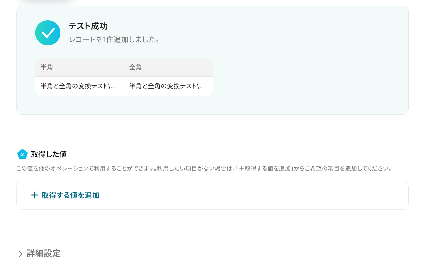 テストが成功したら「取得した値」が表示されます。