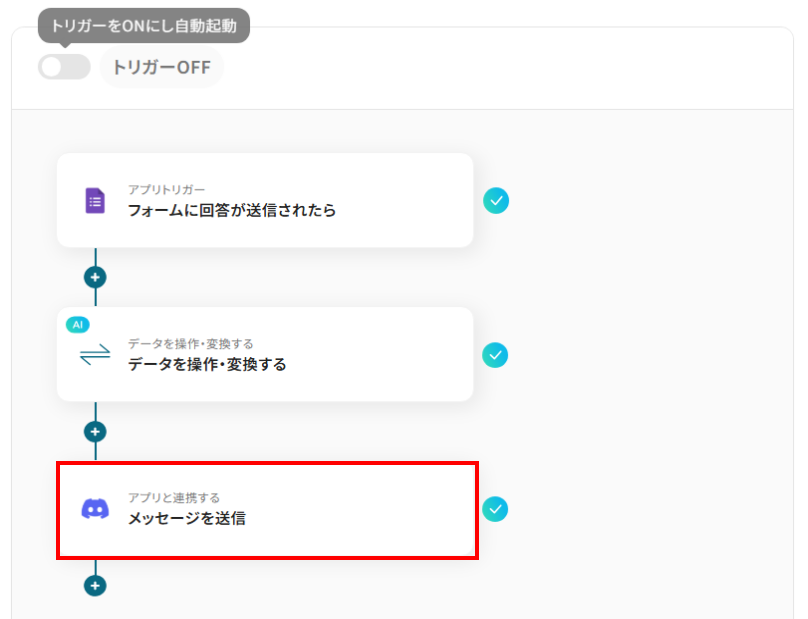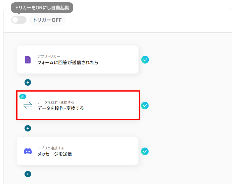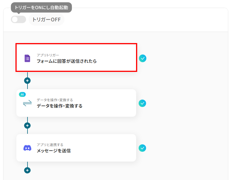 - Googleフォームのトリガー設定、テキスト変換の設定、Discordのアクション設定