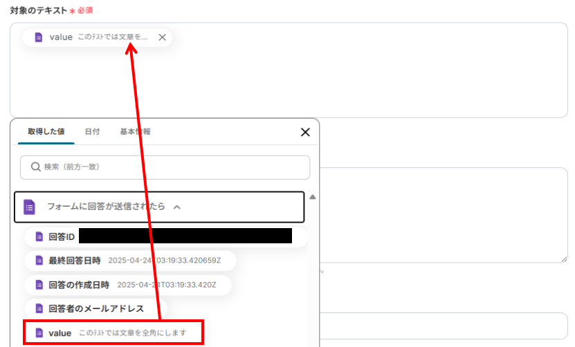 - 対象のテキスト:入力欄をクリックすると、下記のようなアウトプットが表示されますので、Googleフォームの回答を選択しましょう。