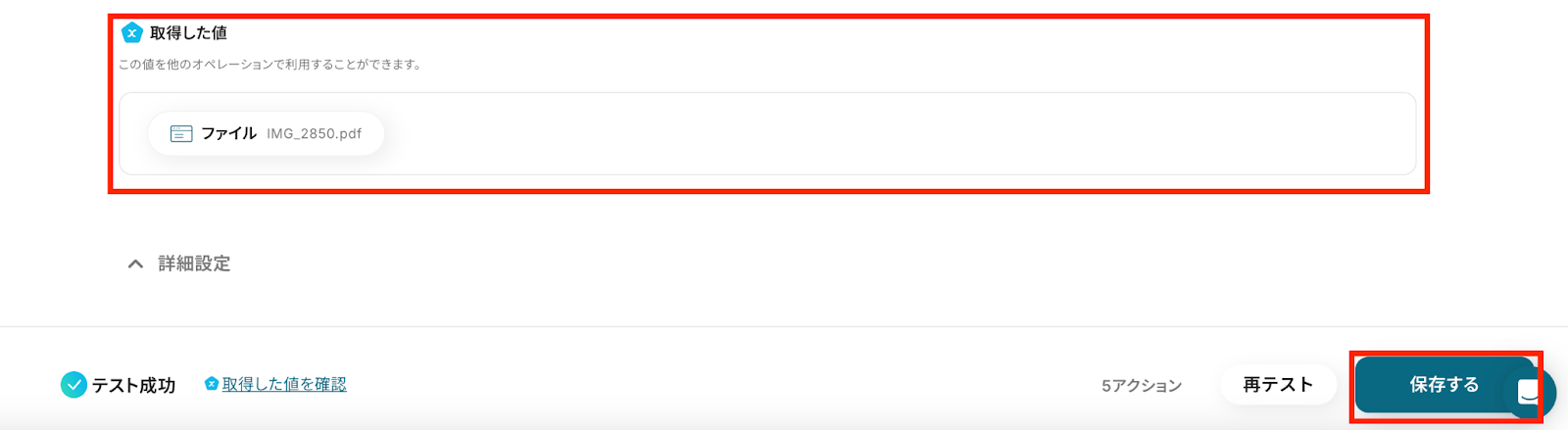 ③一度指定したフォルダに取得したい形式と同様のPDFをテストで格納し、Yoomに戻ってトリガーテストを行い取得を確認したら保存します。