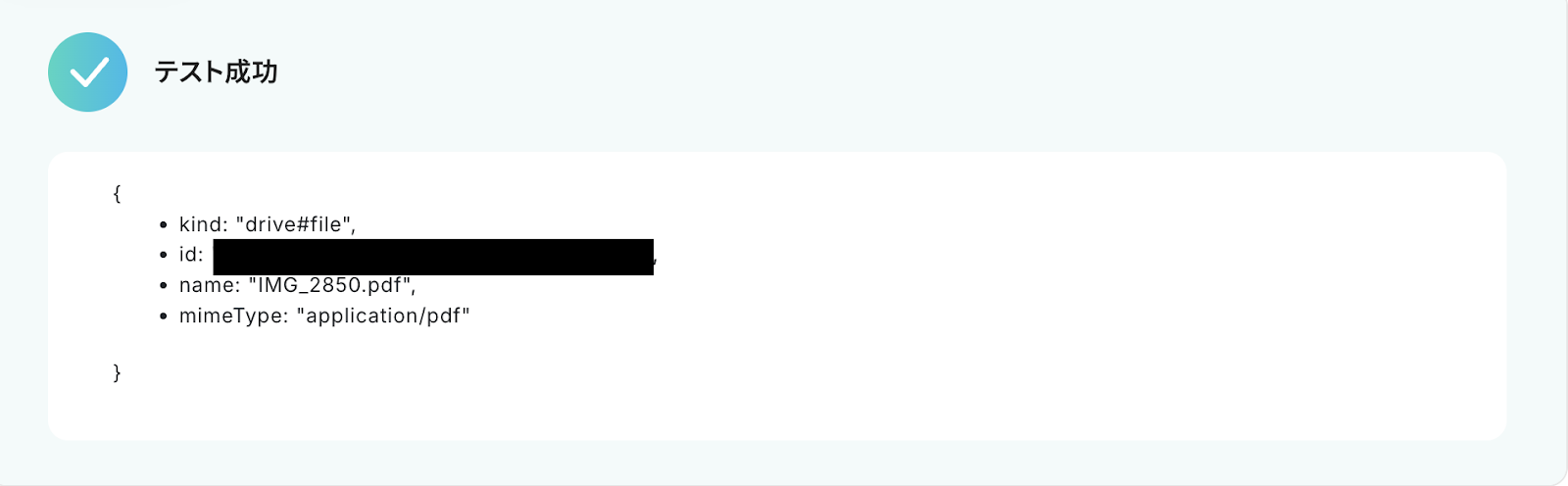 7,「テスト成功」と表示が出たら、アウトプット(取得した値)が取得されます。