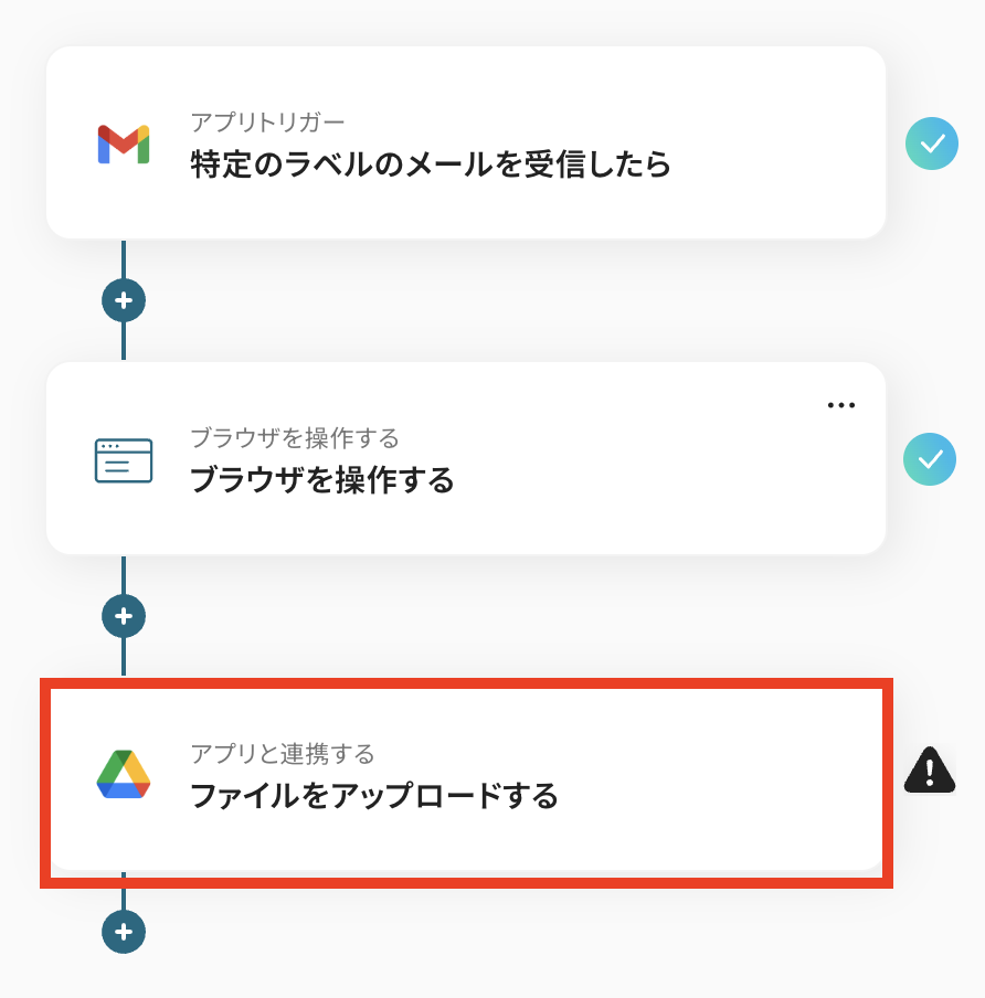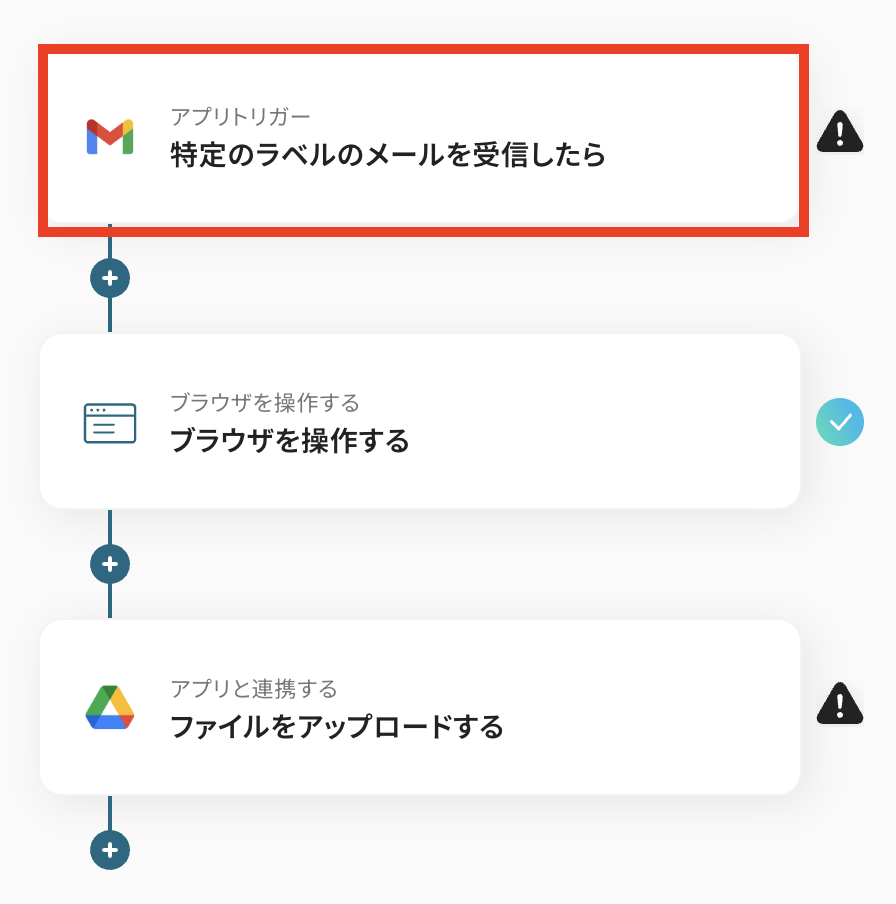 トリガーアクションは、「特定のラベルのメールを受信したら」のままで結構です。