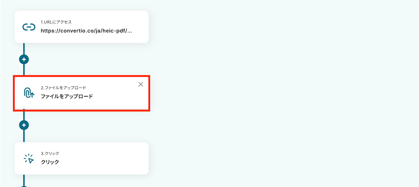 また、ファイルを変換するためのWeb上の操作として、クリックアクションを追加する必要があります。