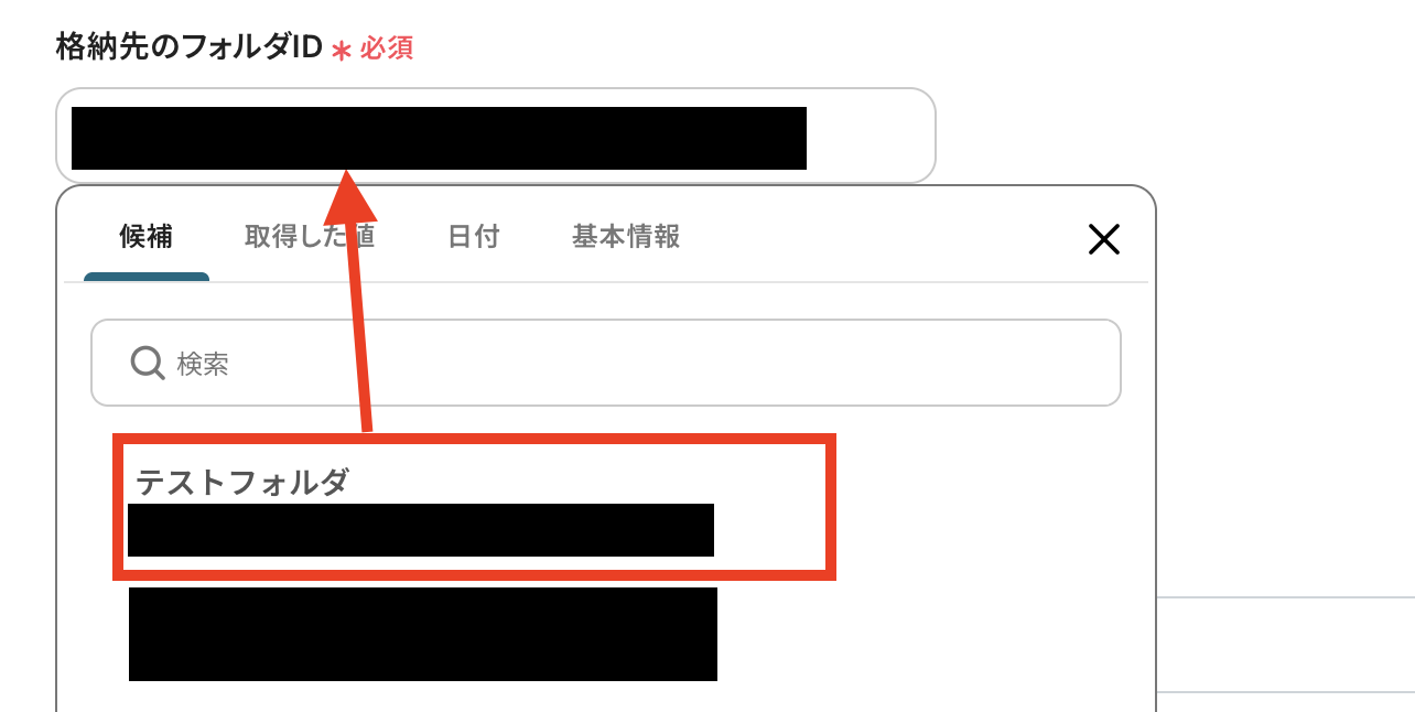空欄をクリックすると候補が表示されますので、格納先のファイル名をクリックしてください。