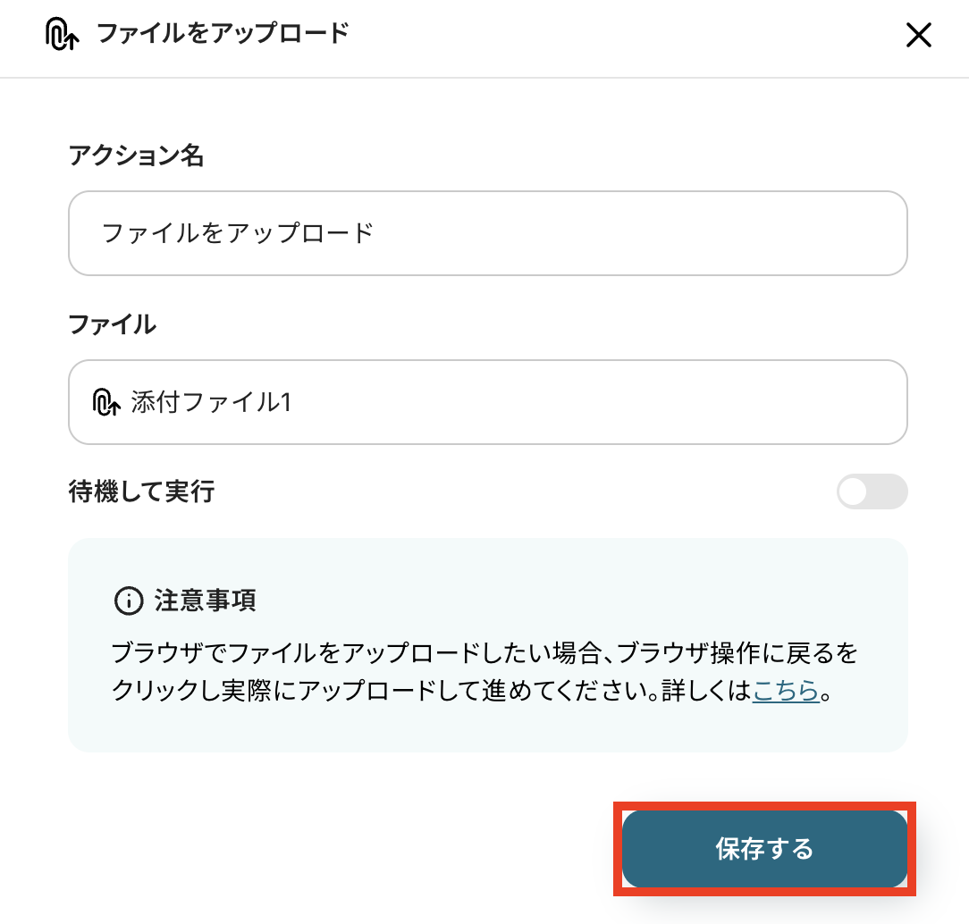 問題なければ、アクションは「ファイルをアップロードする」のままで、次へ進みます。