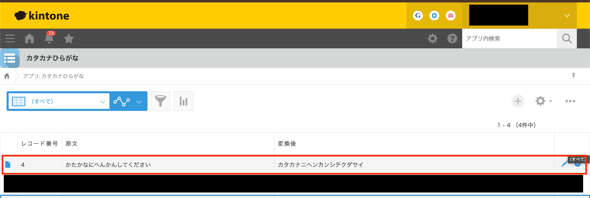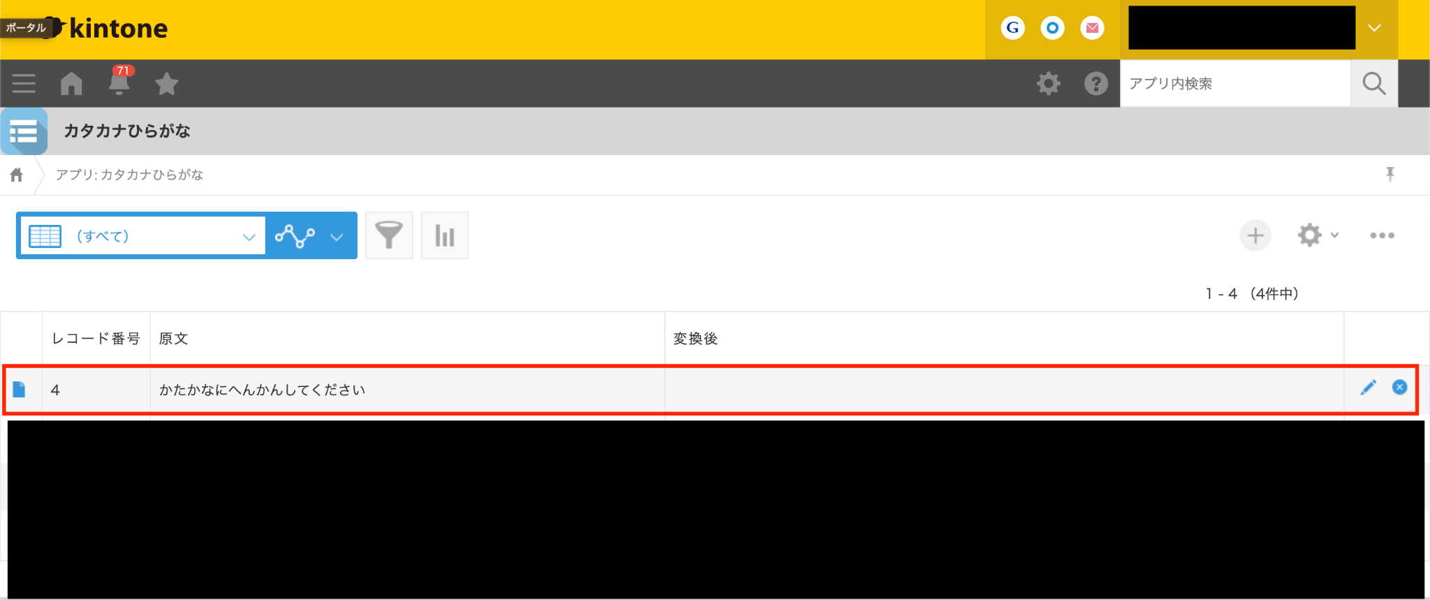例では、レコード番号4に「かたかなにへんかんしてください」という内容が登録されています。