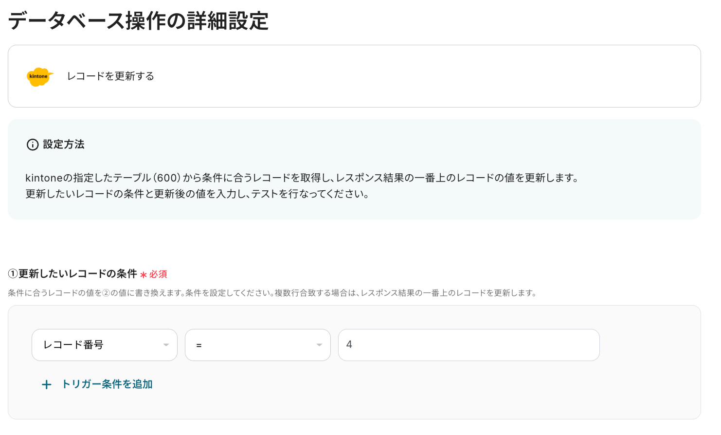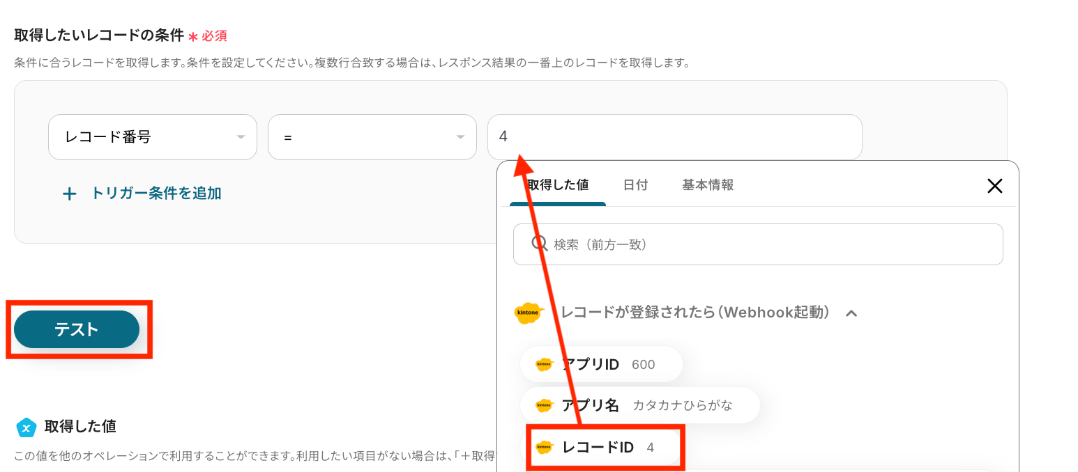 「レコード番号」=「レコードID(Webhookで取得した値)」を指定し、「テスト」をクリックします。
