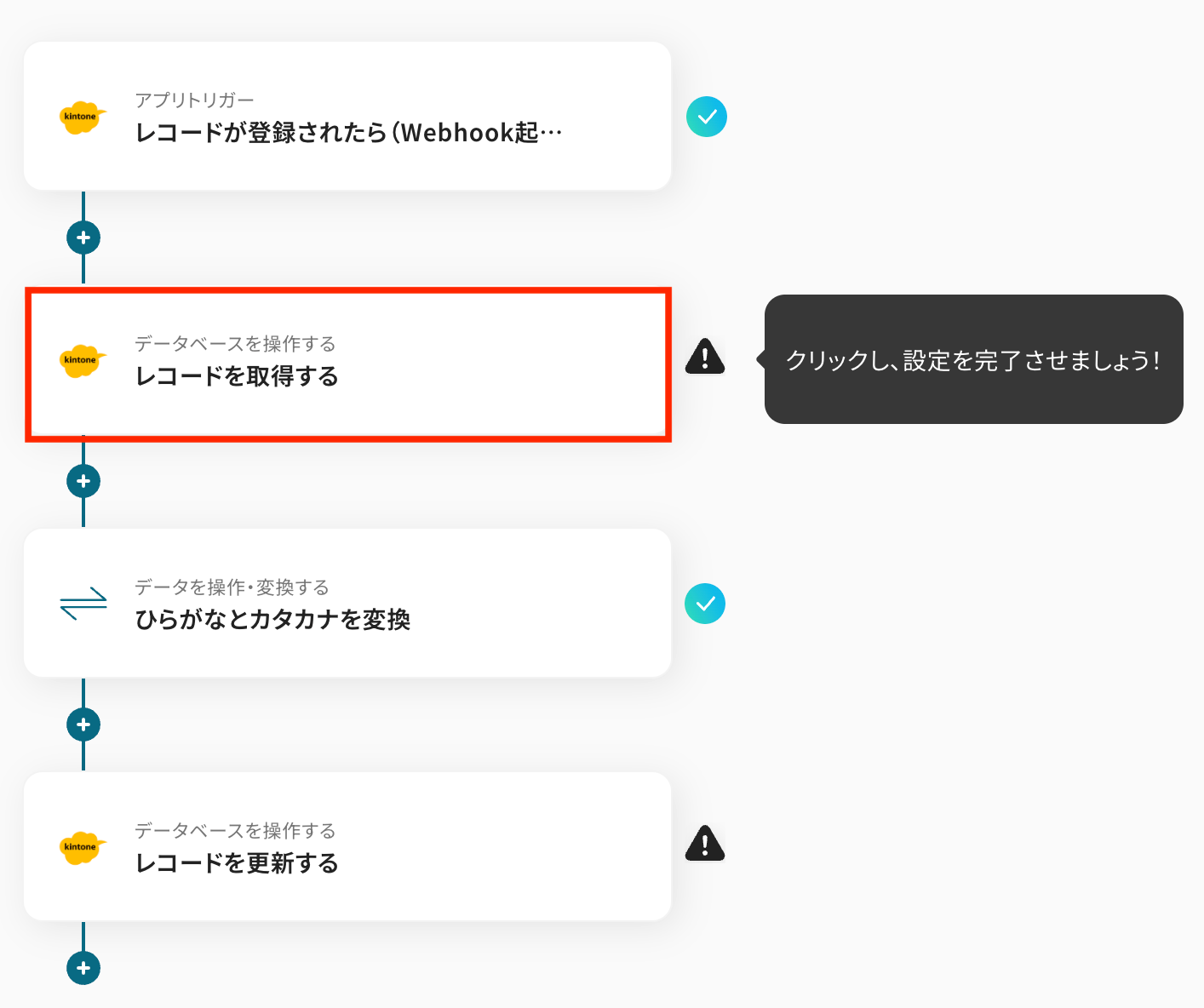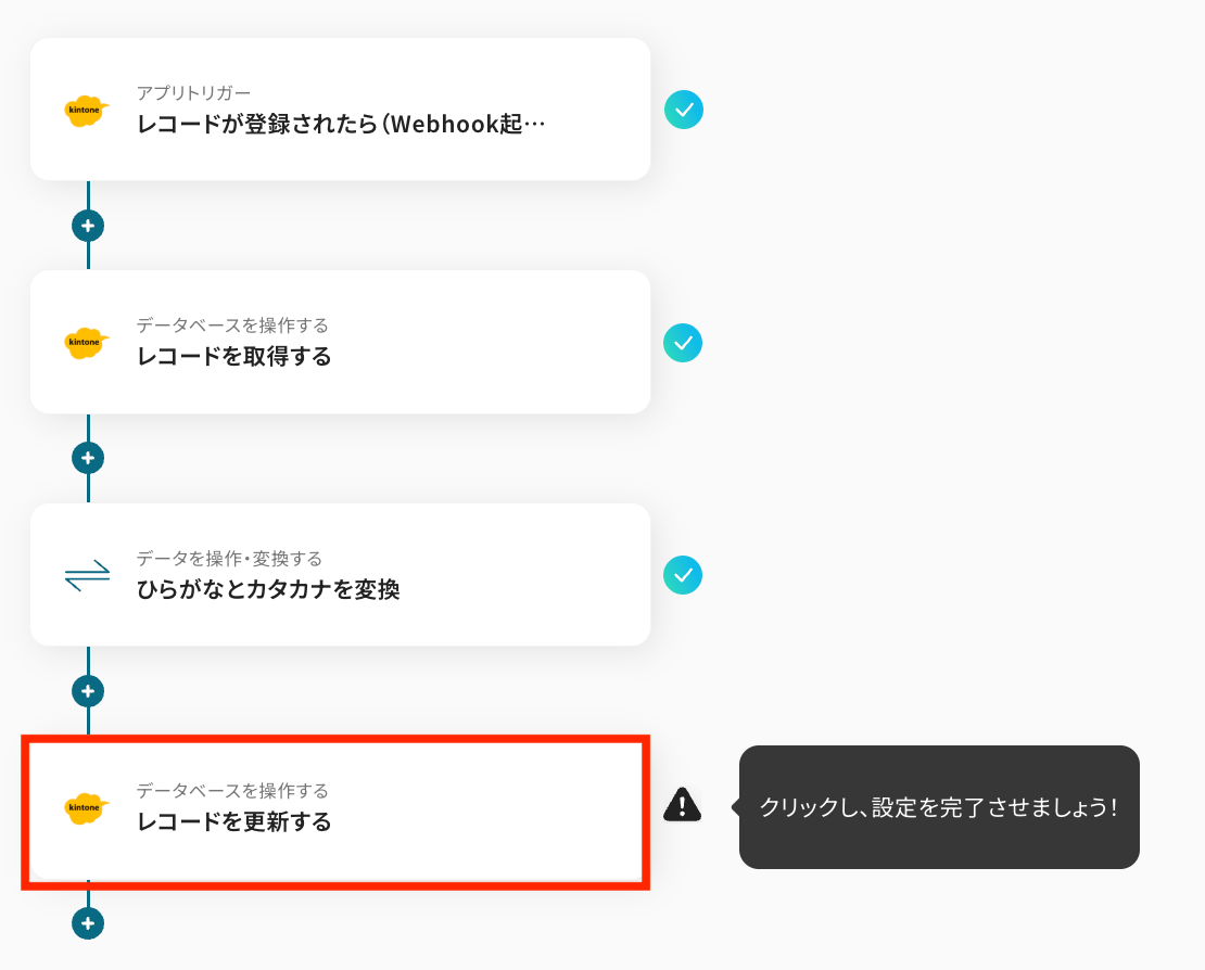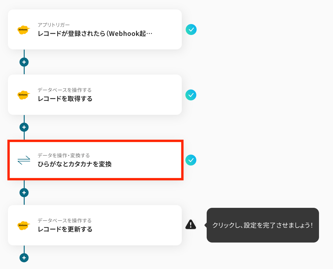 kintoneなどのデータベースサービスにデータが追加されたのをきっかけに、特定のフィールドに含まれるひらがなをカタカナに自動で変換することができるため、手作業によるデータ整形の手間を減らし、常に表記が統一されたデータを維持できます。