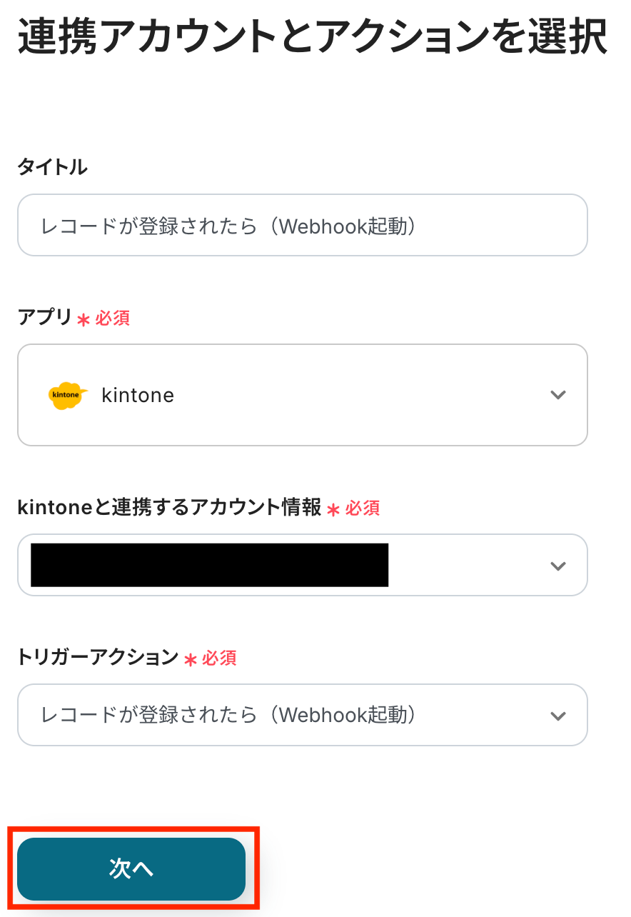 「レコードが登録されたら(Webhook起動)」をクリックして設定を進めます。