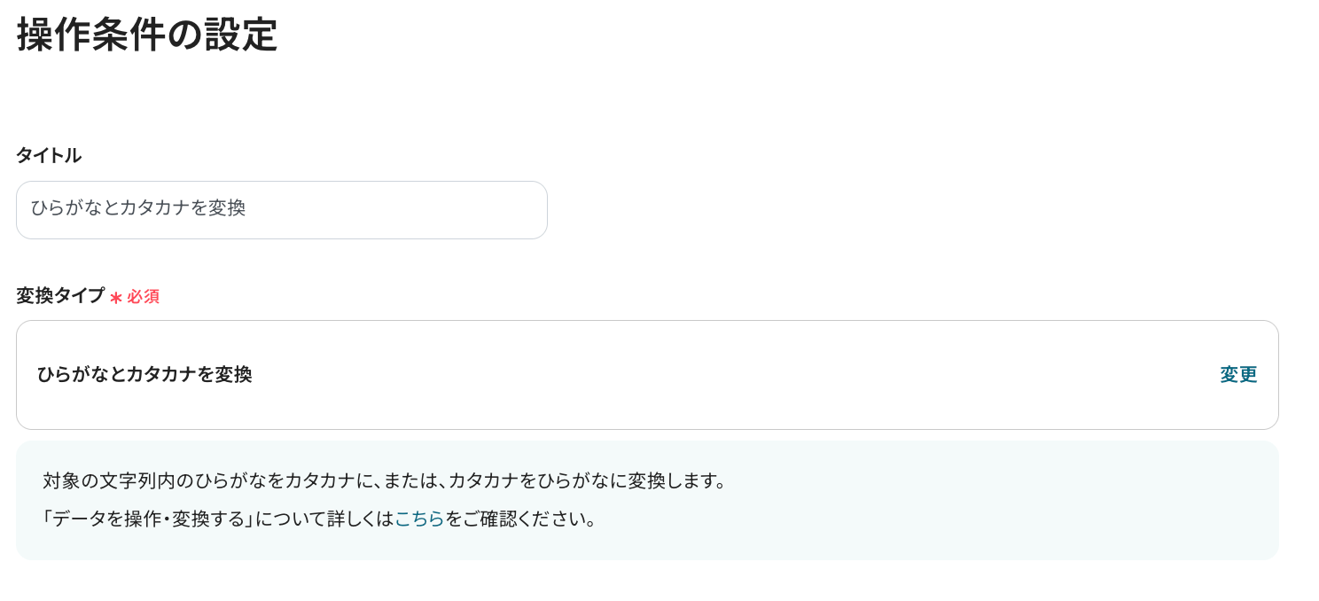 操作条件の設定画面で「変換タイプ」に「ひらがなとカタカナを変換」を選びます。他にも設定できる変換タイプについては注釈からご参照ください。