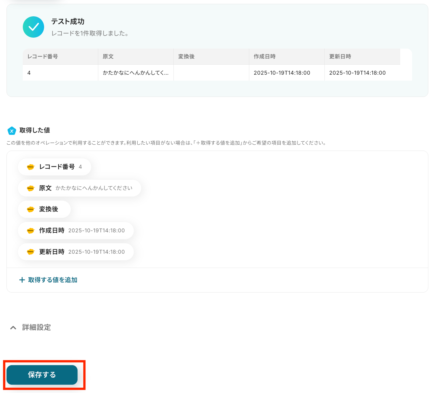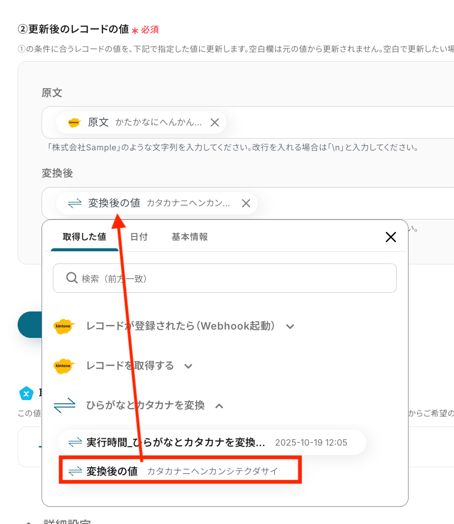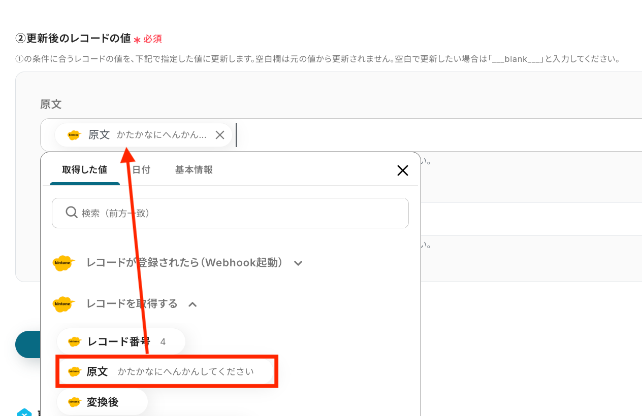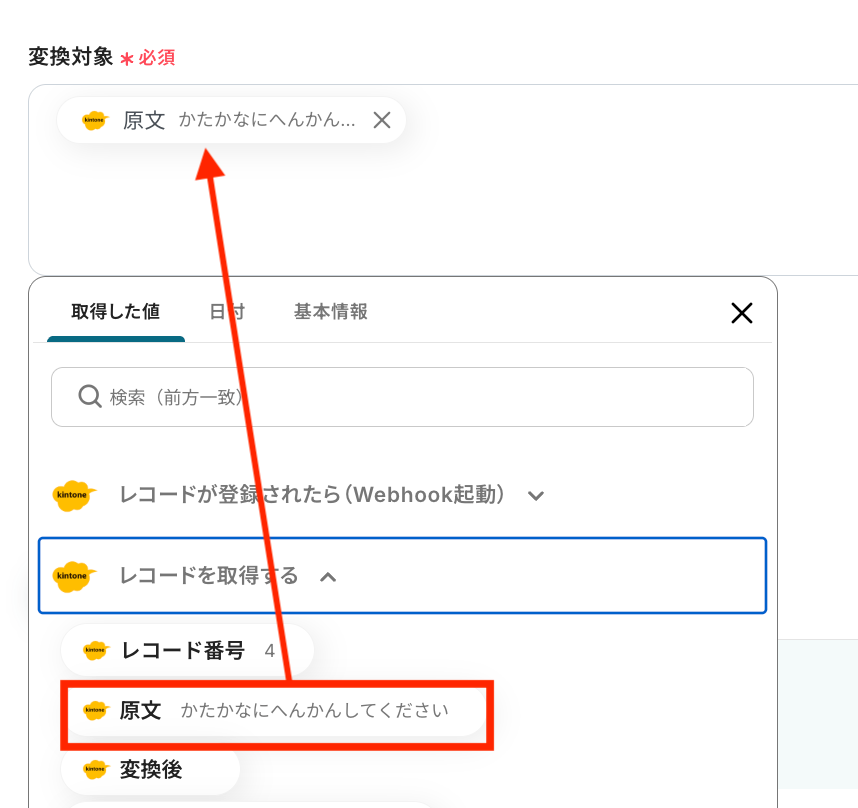 変換対象に、前ステップで取得した値からレコードの「原文」フィールドを指定します。