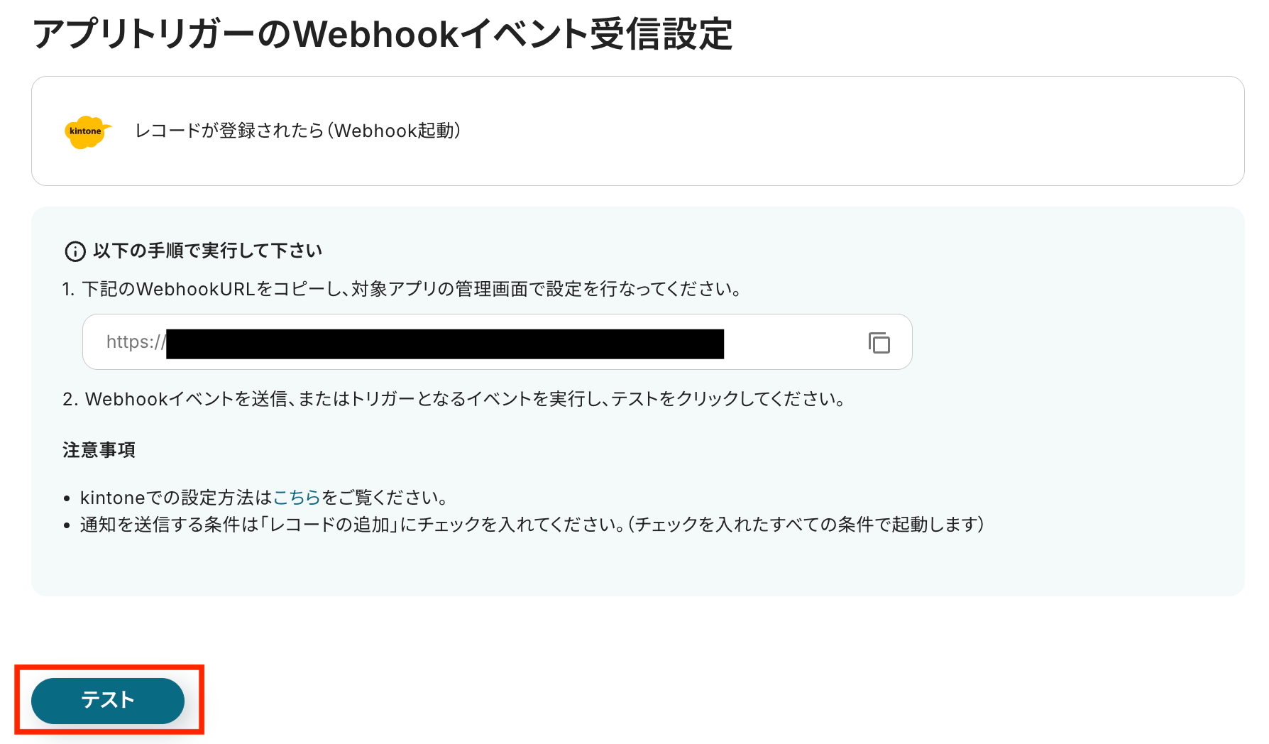 表示されたWebhook URLをコピーし、kintoneアプリの管理画面に登録します。注釈に沿って設定方法を確認しましょう。