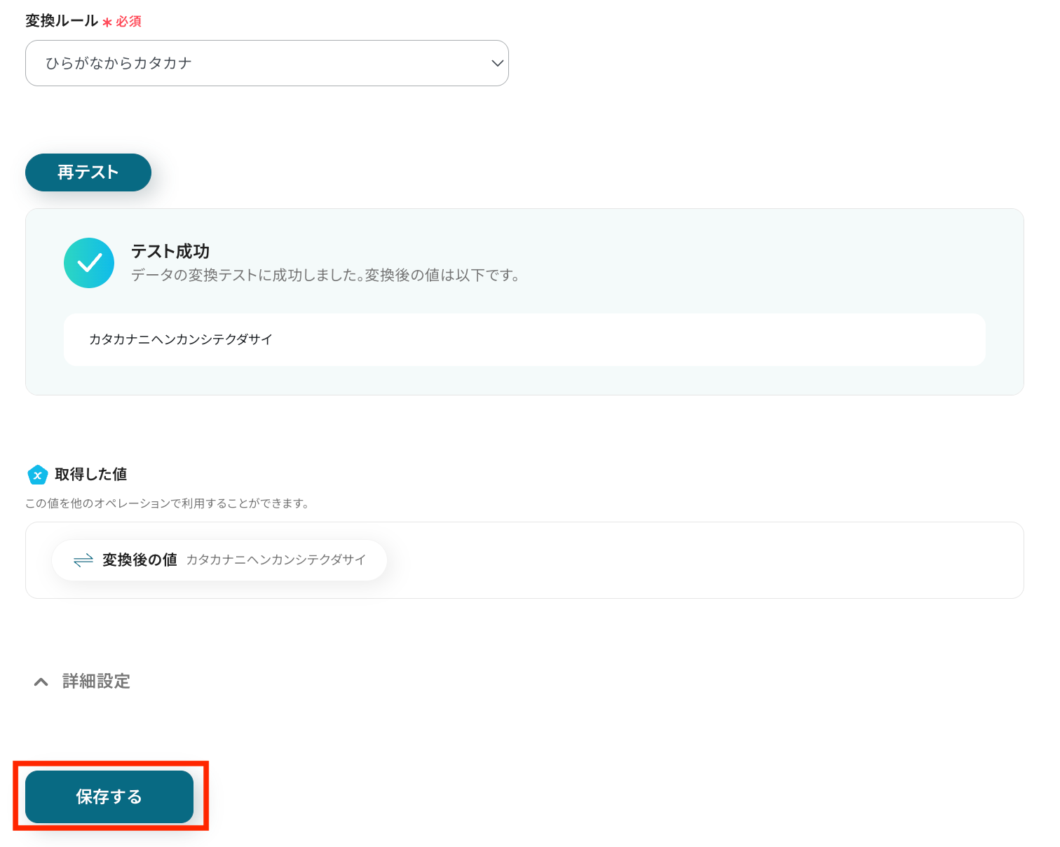 「変換後」には取得した値から「カタカナニヘンカンシテクダサイ」を指定します。