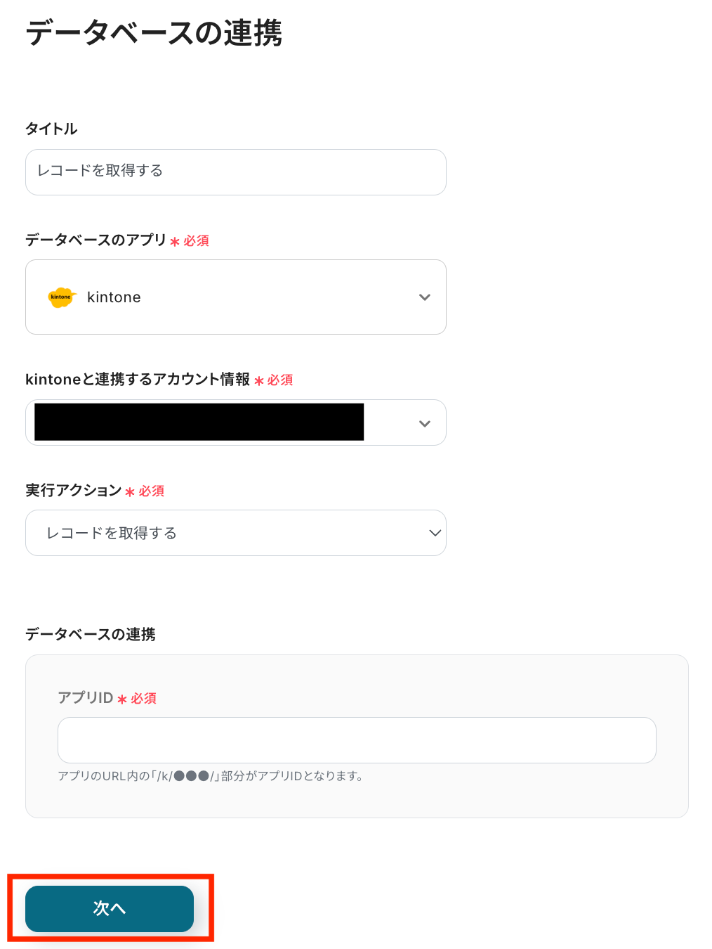 連携するkintoneアカウント情報とアクション「レコードを取得する」を選びます。