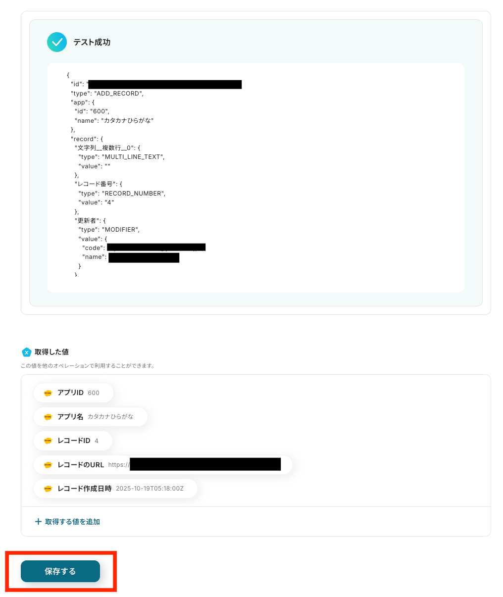 取得した値(アプリID・レコードID・URLなど)を確認し、「保存する」をクリックします。